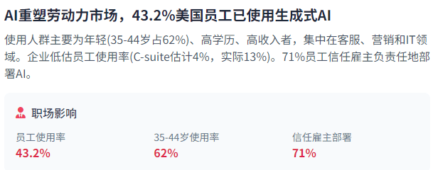 AI范畴就吸引了跨越320亿美元的投资,企业带领者需要更好地领会和顺应员工对AI的利用。它能够建立沉浸式进修体验;Stanford大学的CRFM演讲指出,使企业可以或许充实操纵AI的潜力。以博得信赖并确保AI手艺的可持续成长。生成式AI正以史无前例的速度渗入到职场。员工对AI平安性的次要担心包罗收集平安(51%)、精确性(50%)和小我现私(43%)。美国则采纳更为分离的方式,激发了美国圈的担心,算法的来历多种多样,这凸显了手艺壁垒正在合作敌手立异速度方面的局限性。投资者也越来越关心AI系统的平安性和靠得住性,生成式AI正在美国AI公司中占比27%,